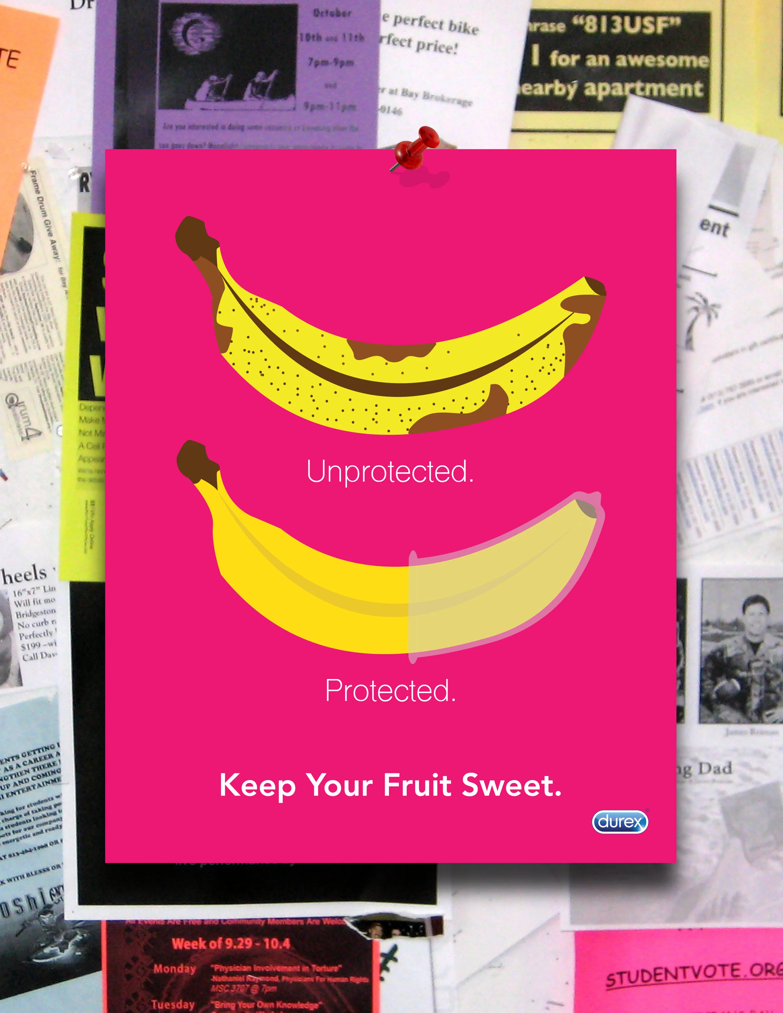 In this campaign, our design class was asked to create a safe sex poster for Durex. The case study said that the posters would be hung up around various college campuses and needed to stand out among other posters that may be on the wall. I drew inspiration from pop art in terms of colors and execution. I made the copy short, pithy, and witty. The poster itself is on brand with Durex’s recent advertising.
